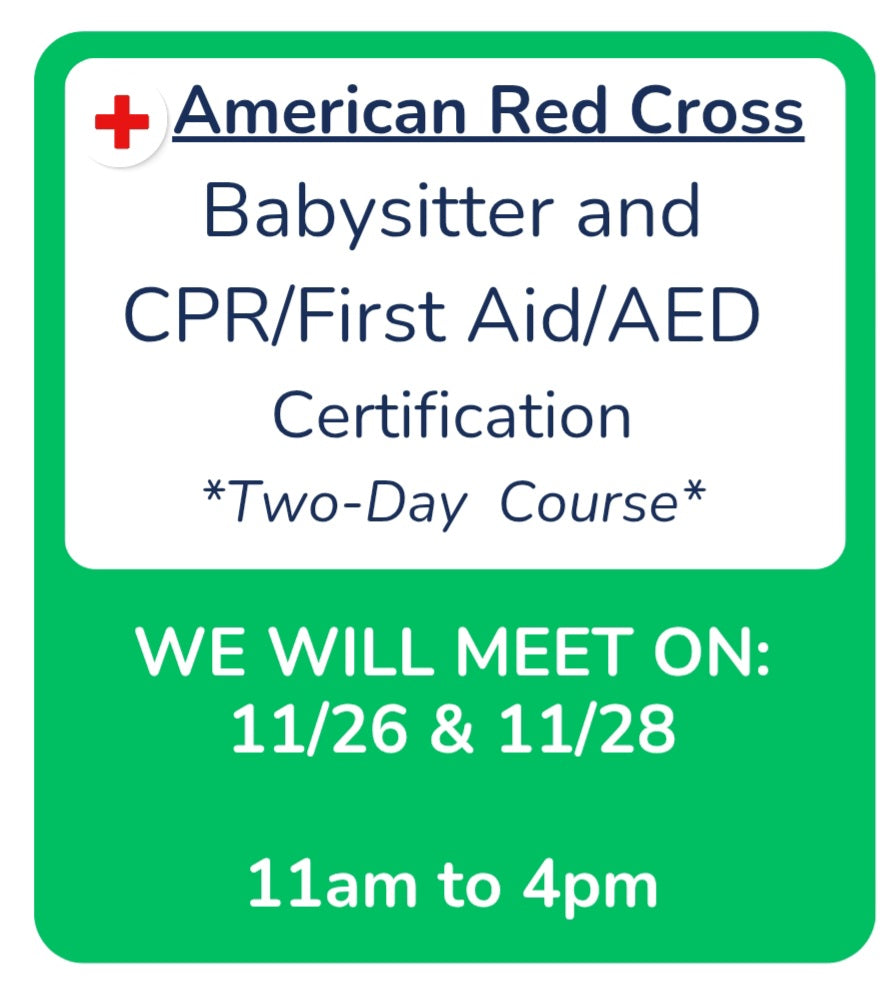 2-Day Babysitting Class over Thanksgiving Break -- Meeting on 11/26 & 11/28 -- 11am to 4pm -- Red Cross Babysitter and Adult&Pediatric CPR/First Aid/AED Certification