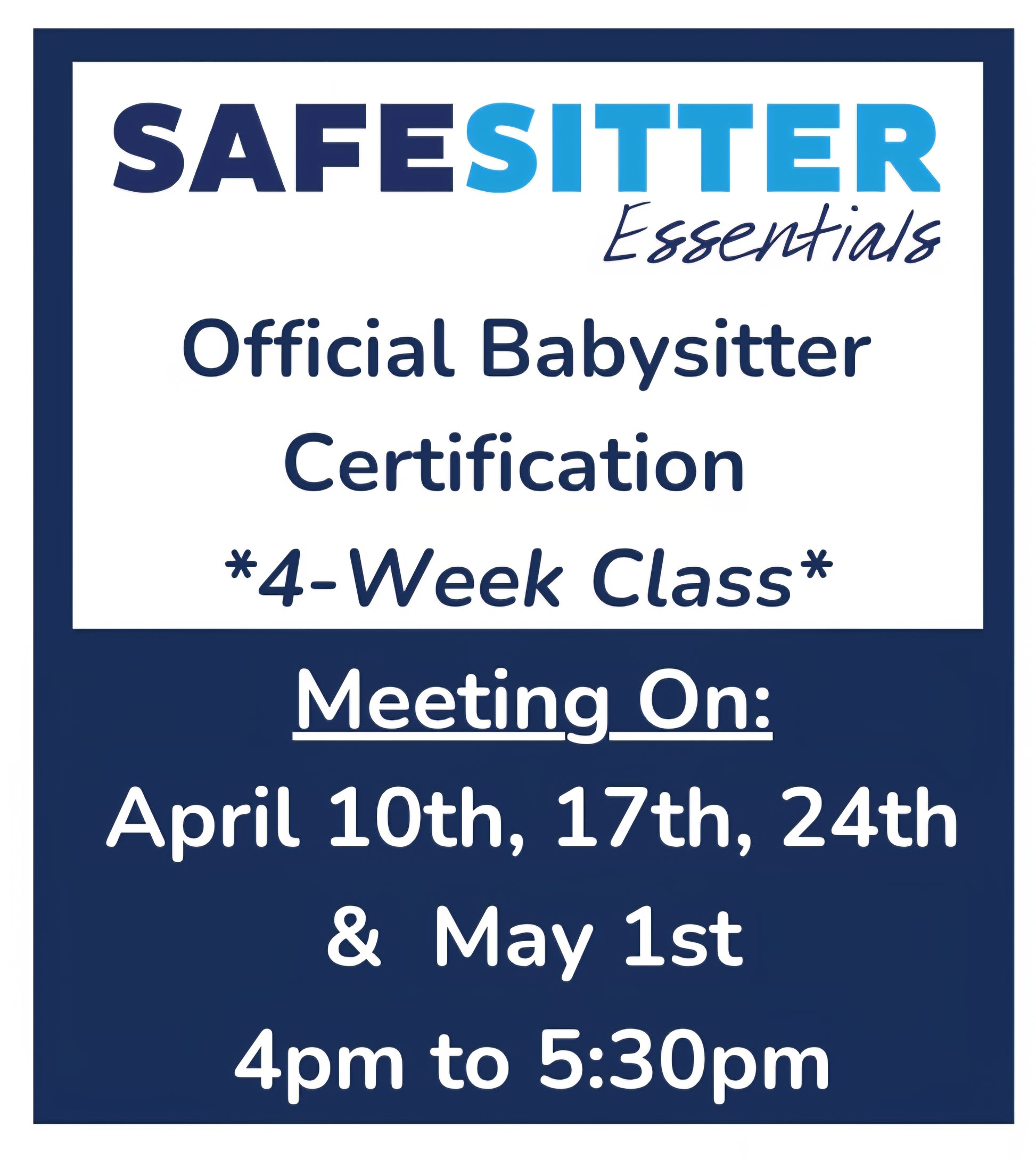 4-Week Class - April 10th, 17th, 24th & May 1st - 4pm to 5:30pm - Safe Sitter Essentials Babysitter Certification