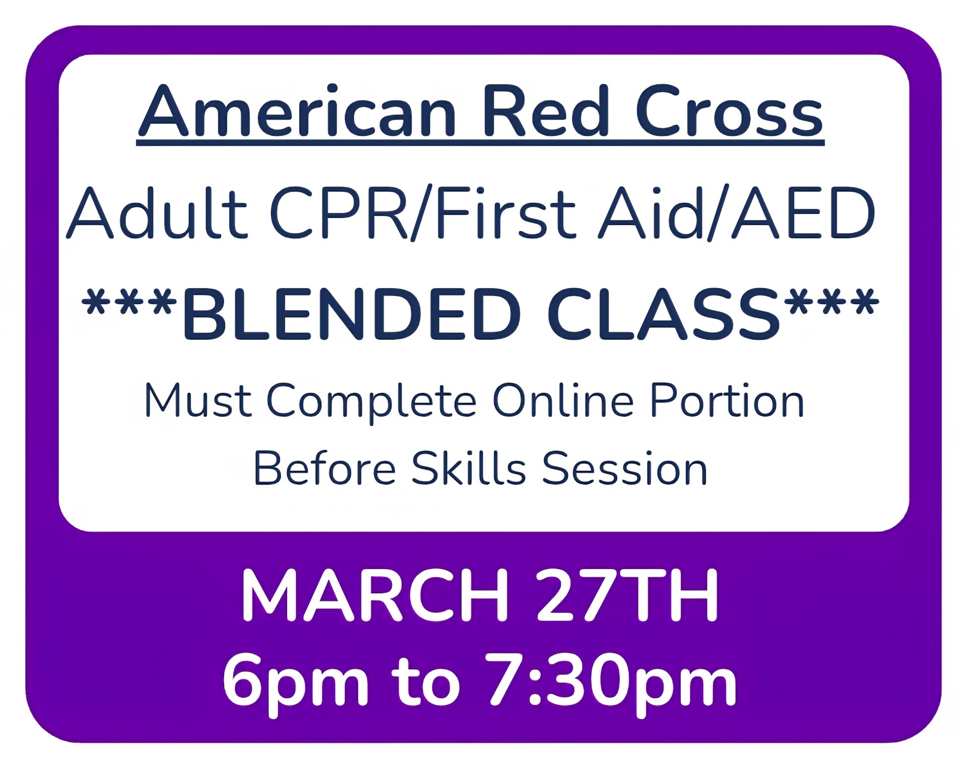 Fri, Mar 27th - 6pm to 7:30pm - Classroom Session for BLENDED Online+Classroom -- Adult CPR/First Aid/AED